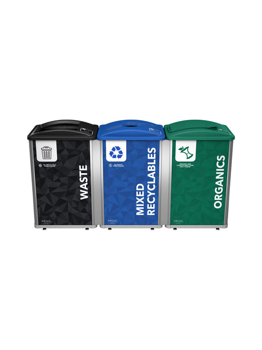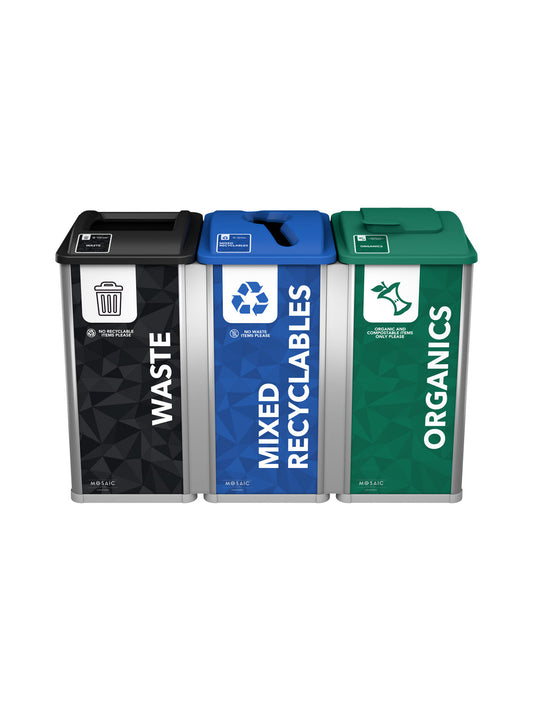 MOSAIC - Triple - Kit - Waste-Recyclables-Organics - Full-Mixed-Solid Lift - Silver-Black-Blue-Green